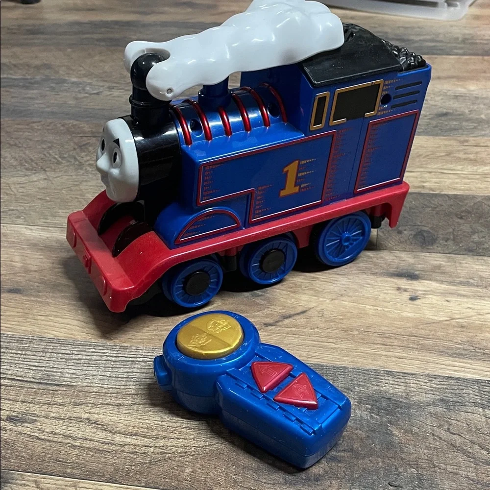 Interactive blue and red remote control train toy featuring a friendly face and bold number 1. Easy-to-use remote lets kids control forward and backward movement. Durable plastic design built for active play. Bright blue and red colors add energetic appeal.