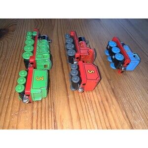 These are action figures from the Thomas & Friends franchise. It is a pull-along/push-along toy made of metal and part of the Take-n-Play Along product line. The model is from 2002 and suitable for both genders. The toy is a train, specifically a magnet connect train, and is part of the creative toys/activities category. The brand is Learning Curve.