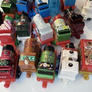 Very cute assortment of 17 Thomas & Friends mini plastic trains. Various Christmas/Winter/Holiday themed designs with classic characters. Most trains are from the Thomas advent calendars.