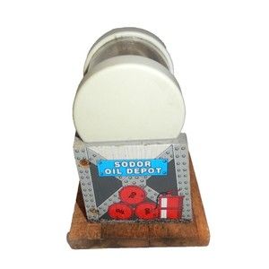 Buildings include: Helipad, Drawbridge, Sodor Shipping Co, Sodor Coal Co Loader Station, Sodor Oil Depot, Train Roundhouse, Red Suspension Bridge