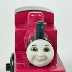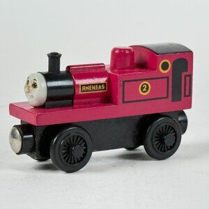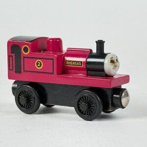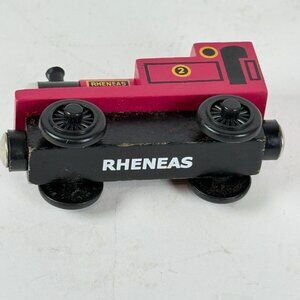 Vintage wooden railway Rheneas train engine features a magnetic couple system, vibrant red and black paint, and detailed markings. Compatible with Thomas & Friends railway sets.