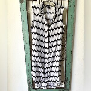 Thomas Wylde sleeveless shirt dress with a black and white zig-zag pattern. Thomas Wylde is a Los Angeles-based brand known for mixing romanticism, rock 'n' roll edge, and avant-garde aesthetics