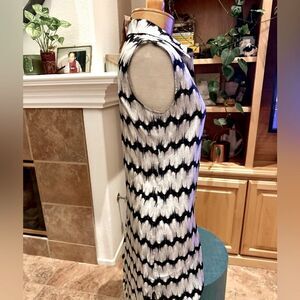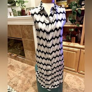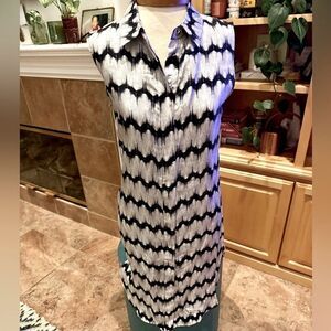The dress is made from 100% silk. It is light weight and perfect for your next vacation!. It features a collared neckline, hidden buttons down front, and a high-low hemline. The zig-zag pattern creates a visually striking effect, and the dress's design suggests a blend of casual and chic styles, suitable for various occasions. Very popular celebrity brand. Dress form is a size 2.