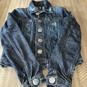 Shine β¨ like diamonds π This is vintage dark Wash designer π©βπ¨ π― % cotton denim jacket from NYC showroom circa 1994 I believe. Super rare. Size 6 see measurements. Distressed denim looks worn but edgy and polished! Secure pockets. Biker look π carefully cleaned with Lysol Laundry π§Ί Sanitizer and stored sealed.