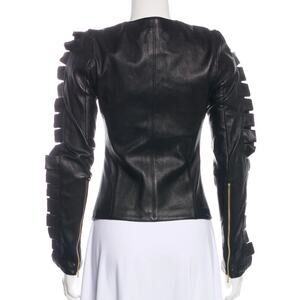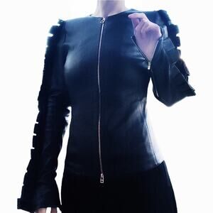 Thomas Wylde Custom Ruffle Statement Long Sleeve Black Leather Jacket, Size XXS (MSRP $2,375)