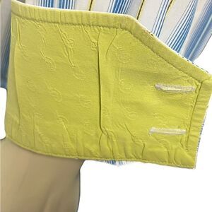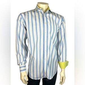 Super sharp long sleeved casual dress shirt from Thomas Dean in white with vertical tonal blue stripes, from turquoise to light blue and brown pinstripe, trimmed in yellow and finished with white mother of pearl buttons. Inside the collar and cuffs, a lime green tonal paisley adds extra class to this awesome pre-loved button down. It's 100% cotton and the size large measures:
