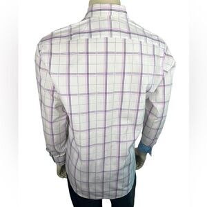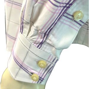 This super sharp casual button down from Thomas Dean is in excellent pre-owned condition, is 100% cotton, in white with purple, and pink plaid with black pinstripes. Inside the collar and cuffs, a complimentary fabric is featured in turquoise and light blue check with purple and white stripes, finished with white mother of pearl buttons. The size large measures: