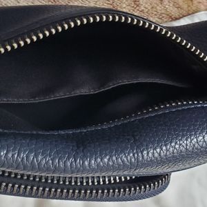 Navy Blue Thompson Coach Leather/Signature Canvas Belt Bag with 2-Zipper closures. Excellent Condition. Unisex. Inside multifunction pocket with fabric lining. Adjustable Strap for wear at waist. Outside roomy zip pocket. Approximately 16" (L) X 6.75" (H) X 2.75" (W).