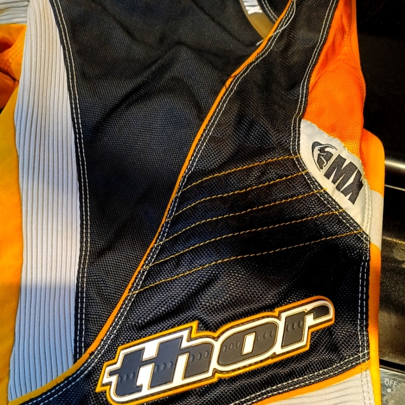 Stylish Thor racing pants. Features bold black and orange colors. Perfect for motorsport enthusiasts.