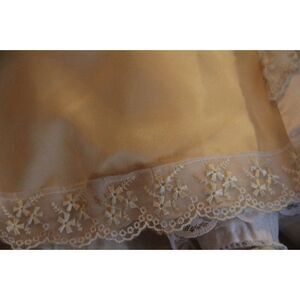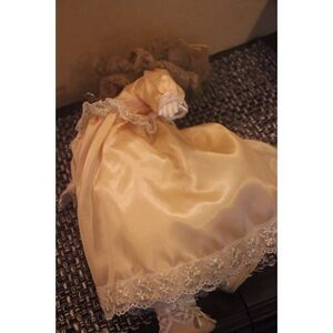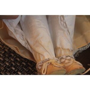bottom of shoe worn off, stains noted on inside of legs and front of bottom of dress