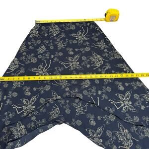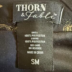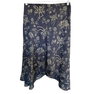 The Thorn And Fable Skirt in size S features a whimsical pattern of skeleton butterflies, perfect for a variety of occasions from travel to casual outings. Made from chiffon fabric in a sleek black color, the skirt is machine washable and has a midi length with a hi-lo hem style. With accents of layering, this skirt embodies a dark fairy, gothic, and grunge theme that is both lightweight and suitable for all seasons, making it ideal for summer, fall, and spring wear. Perfect for women looking to add a touch of bohemian flair to their wardrobe.