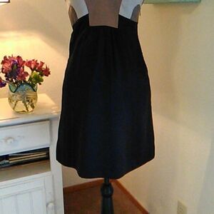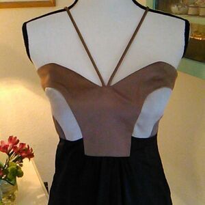 100% silk color block dress. Three warm mocha colors. Soft, satiny fabric. Wonderful seaming on bodice. Crossover straps in back. Spaghetti straps. Fully lined. Side zip. Size 2 measures 32 at chest, 30 at waist, 36 at hips, 34.5 long from shoulder to hem. So sweet, but a little edgy.