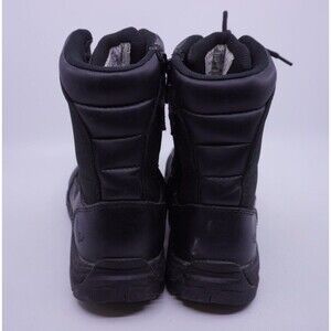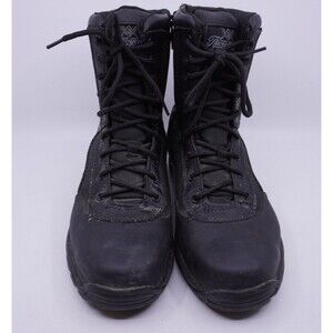 The Thorogood 834-6044 Men's 8" Leather Side Zip Tactical Jump Boots in Black, size 9 Wide (Womens sz 11W), are sturdy work boots perfect for workwear occasions. They feature a round toe shape, zipper and lace-up closure, and a slip-resistant, lightweight design. With a solid pattern and accents like a zipper, these boots are designed for durability and comfort, with a removable single-density polyurethane insole. Perfect for those seeking a reliable and stylish pair of boots for work or outdoor activities.