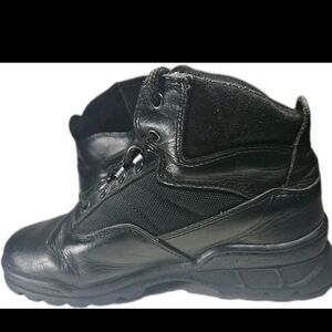Durable black leather combat boots designed for rugged use. Features a secure lace-up system for optimal support.