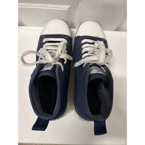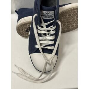 Thorogood men’s safety work sneakers in navy blue with white rubber toe. Designed for comfort and protection, these mid-top work shoes feature a slip-resistant outsole and ASTM safety ratings, making them ideal for warehouse, industrial, or job-site wear.