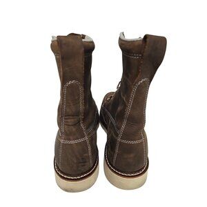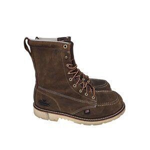 Durable and rugged, the Thorogood Men's 8" Steel Toe Work Boot offers superior protection and comfort for demanding jobs. Made in the U.S.A., these brown boots feature a wide fit, ensuring all-day support and safety.