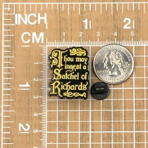Tell them nicely to eat a bag of d*cks! Yellow enamel over a black base stating, "Thou may ingest a Satchel of Richards"