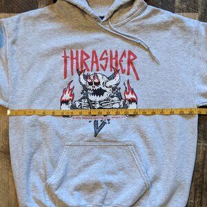 This is a Thrasher hoodie in grey. It is in excellent pre-owned condition. It is a size medium, and the last three images show measurements. Pullover style, front kangaroo pocket, drawcord hood, front skeleton with horns on wheels graphic, cotton polyester fabric with a warm fleece interior.