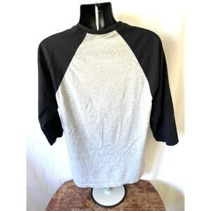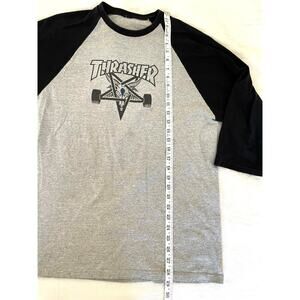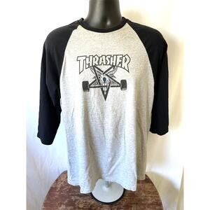 Thrasher Magazine black and gray raglan baseball tee featuring the iconic goat pentagram skateboard logo graphic. Soft cotton blend fabric with 3/4-length sleeves and a relaxed fit. A staple piece for any skater or streetwear fan.