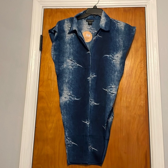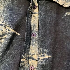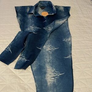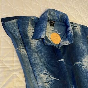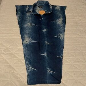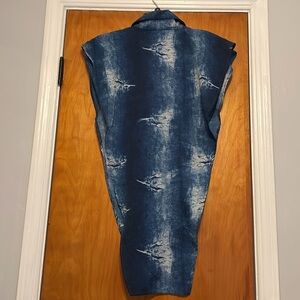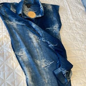 This item is a blue and white button up shirt with both sides open.