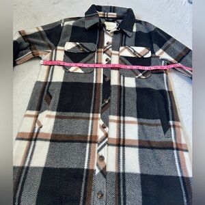 Cute and Cozy Thread & Supply branded Shaket (shirt + jacket) in a classic black/orange/white Autumn color scheme in a plaid flannel pattern, super soft fleece like fabrication, side pockets, button chest pockets, oversized fit, shirt tail hem, longer length button cuffs.