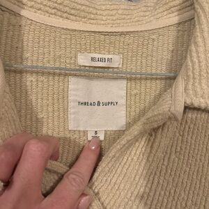 Thread and supply, size small jacket! This is a super cute cream color with light colored tortoise shell buttons! Very warm and comfortable, and hasn’t been worn very many times, so there isn’t much if any pilling! Perfect way to elevate a fall outfit!
