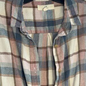 Cozy and casual, this Thread + Supply Cassian shirt features a soft plaid pattern in muted pinks, greys, blues, and tans—perfect for year-round layering. Made from a comfortable 60% cotton / 40% polyester blend, it offers an easy, relaxed feel.