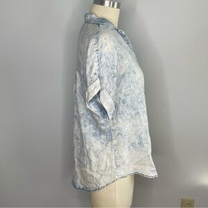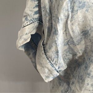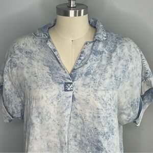 This shirt screams warm weather. Super lightweight. Cuffed short sleeves. Small V neck with collar. High low design to cover more of your butt. Gathered pleat in the back. Curved hemline. Color looks like an acid washed blue- so there is a mix of blue and white throughout. Perfect for the Spring and Summer! Just throw it on and run out the door!