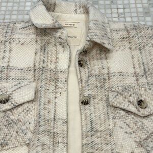 Thread & Supply Cream Brown Tan Plaid Jacket with Pockets. Rory Boucle Shacket. Buttons and collar.