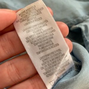 Lightweight denim button-down shirt. Light jean wash, sleeves unbutton and can be rolled up. Color slightly lighter on shoulders.