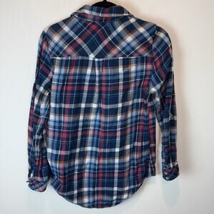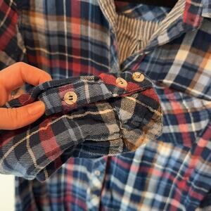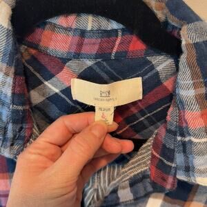 Gently Used Thread & Supply Button Down Flannel Shirt. This is a women's medium. Red, white, and blue plaid pattern throughout. Front pocket. Vertical stripe interior. Cute! Care tag is gone, but my opinion would be a cotton blend.