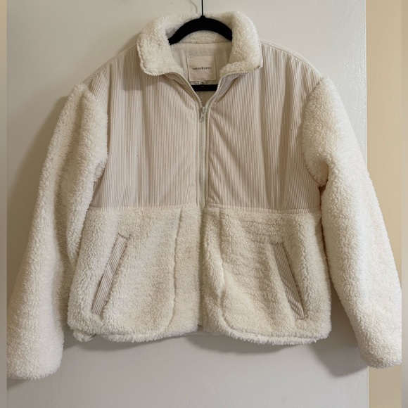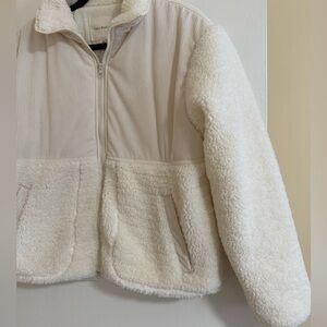 Ivory sherpa jacket with ribbed texture. Features a zip closure and soft collar.