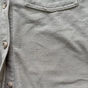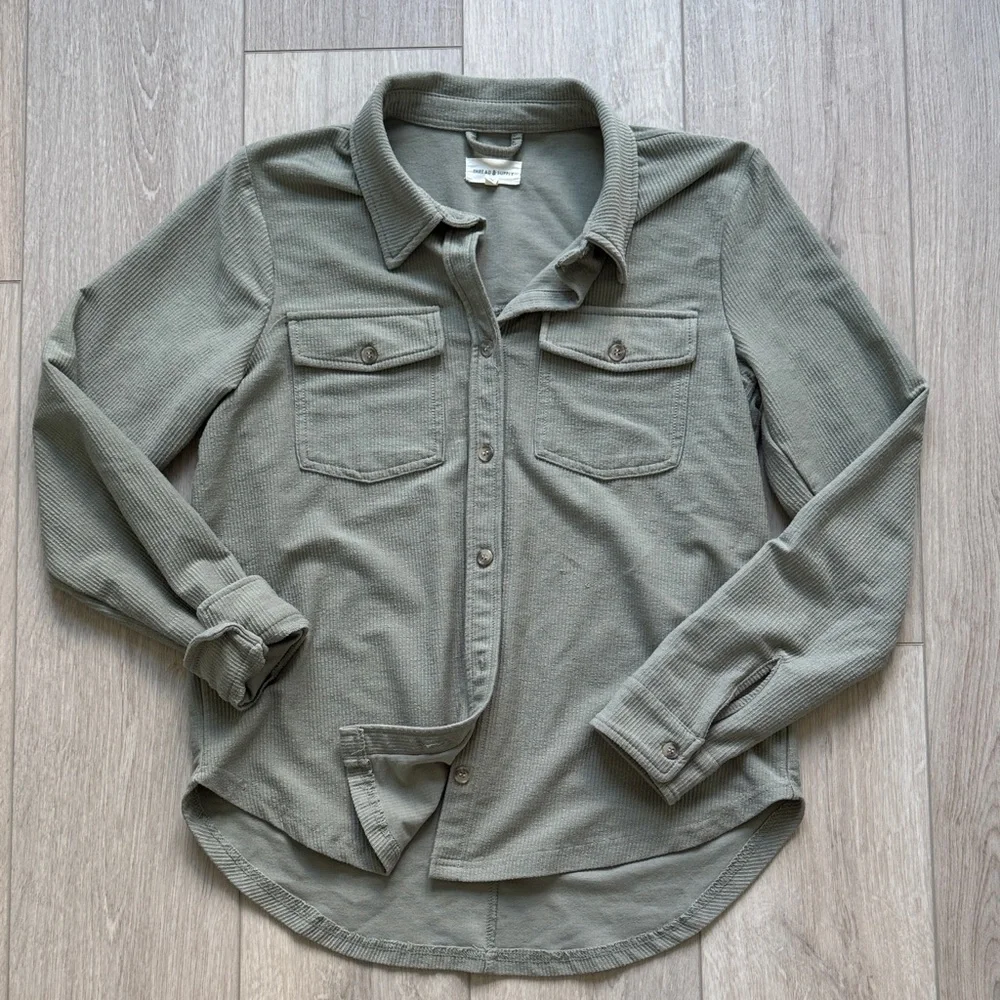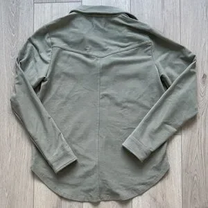 Elevate your casual wardrobe with this sage green shirt jacket. Ideal for layering and everyday wear. Some snags under left shirt pocket.