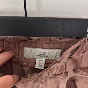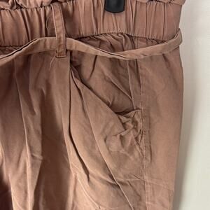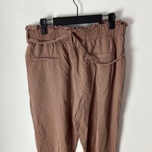 Gently Used Thread & Supply . These are a women's large. Cool shade of pink brown throughout. Flowy straight leg fit to them. Two front pockets. Ribbon belt that ties around the waist. Cool pants in my opinion! 100% lyocell.
