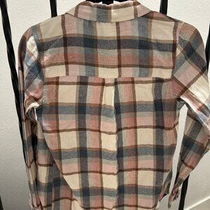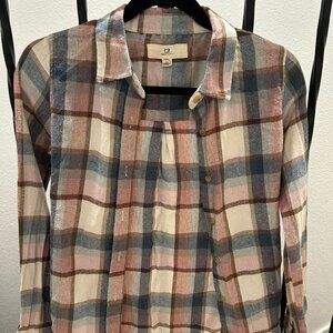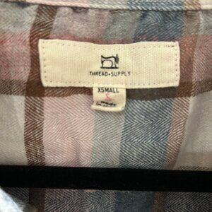 This cozy and stylish Thread & Supply flannel is a perfect closet staple for any season! It features a beautiful muted plaid pattern in shades of pink, blue, and brown. The gauzy, lightweight lyocell fabric makes it super soft and comfortable. It's a versatile piece that can be worn buttoned up or open over a t-shirt. Excellent condition.