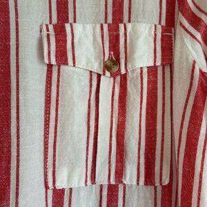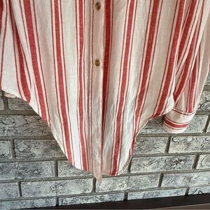 Thread + Supply Red & White Striped Tie-Front Button Down โ€“ Size M This effortlessly cool top from Thread + Supply is giving beach-town vibes with a pop of patriotic charm. Featuring red and white vertical stripes, long sleeves with button cuffs, front patch pockets, and a stylish tie-front hem. Lightweight and breathable with a linen blend thatโ€™s perfect for warm weather, festivals, or layering over tanks and swimsuits. ๐Ÿ“ Button-down front with wood-look buttons ๐Ÿ“ Front tie hem ๐Ÿ“ Two chest flap pockets ๐Ÿ“ 75% Rayon / 25% Linen ๐Ÿ“ Size Medium โ€“ relaxed fit ๐Ÿ“ Excellent condition Hand wash cold, lay flat to dry. spin?