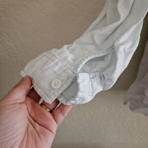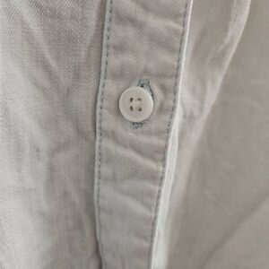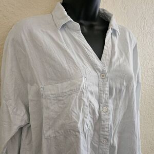 This is a relaxed fit button down shirt by Thread & Supply. It is bella wash, which is a very light blue. This shirt has an extra button sewn onto the inner tag. Note that this shirt is slightly longer in the back than in the front.