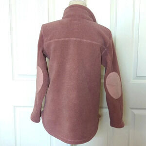 Pullover quarter zip top with a kangaroo pocket in the front. Snap button neckline. Extra fabric on elbows for padding.