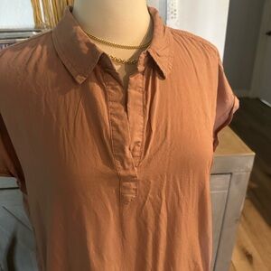 Chic rust color dress with short sleeves. Ideal for everyday wear or vacation. Has pockets. Bin M