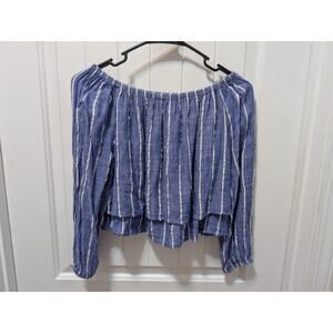 The Thread & Supply Women's Blue White Striped Shirt is a stylish and versatile addition to any wardrobe. This flowy, casual crop top features an off the shoulder neckline and long balloon sleeves, perfect for a relaxed and trendy look. Made from lightweight and breathable rayon fabric, this pullover top is easy to care for with its machine washable quality. Ideal for travel, parties, or casual outings, this top in size M is a must-have for the summer, fall, and spring seasons.