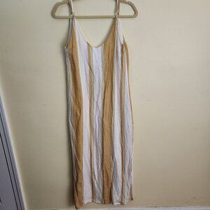 Thread & Supply Tan Ivory Striped Linen Blend Sleeveless Midi Maxi Dress, Size S. Pit to pit 19", shoulder to hem 54", Adjustable Spaghetti Straps, Drop V Neck Back, High Side Slits Both Sides, Logistic, Versatile. Good Pre-Owned Condition