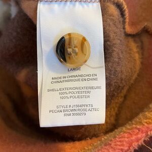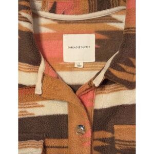This is made by Thread & Supply. It’s a soft button front fleece with a southwest pattern. Size large and in great pre owned condition. Smoke and pet free home.