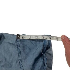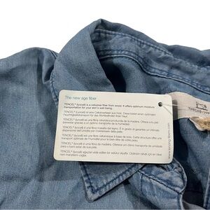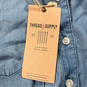 This Thread & Supply women's dress in size L is a stylish addition to any wardrobe. The dress features a solid pattern with a collared neckline, cap sleeves, and a button closure. It is made of lyocell chambray fabric that is both comfortable and machine washable. The dress has beautiful accents with pockets and is perfect for a casual occasion. It comes in light blue color and falls at the knee length. This dress is an excellent choice for summer, fall, and spring. The dress is brand new but with minor defects. There is a small snap/hole at the hem, which I highlighted in the photos. The price reflects the flaw.