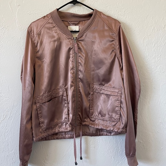Dusty mauve colored, silky Thread & Supply jacket. Drawstring at the bottom. Small snag in the fabric on the back