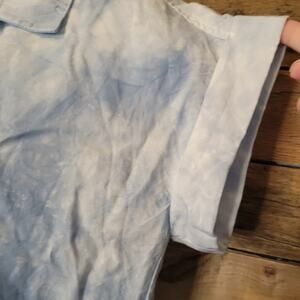 Please note: says extra small on the tag but it is oversized, so you could go up a size. please compare your measurements before purchase. has a tie dye design in a sky blue color and white. the sleeves are short and are sewn to be turned back like that. collared neckline. buttons from neck to hemline. material is soft to the touch. rounded hemline in the back makes the shirt 2 inches longer in the back in the middle. the back has material that criss crosses at the top to overlap the material down the center. there is even a button on the back of the collar of the neck to keep the collar in place. found no issues or flaws. smoke free home and pet friendly home.