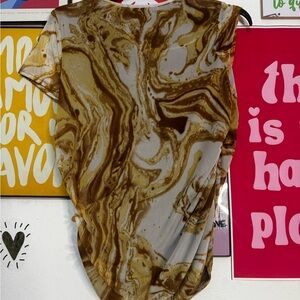 Elevate your wardrobe with this eye-catching blouse from Thread Times New York. This stylish top features a unique marble swirl pattern in warm tones of brown and gold, and a flattering draped hem that adds a touch of elegance to any outfit. Made from lightweight, breathable mesh fabric — perfect for layering or wearing on its own.