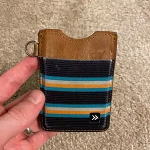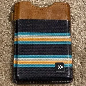 Thread vertical wallet. Has been used but in good condition. Elastic pocket in front is stretched out but will work with cards. Condition noted in pictures.