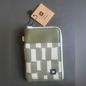 Stylish wallet featuring a geometric pattern. Olive green accents add a modern touch. Compact and functional design.