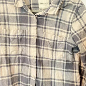 Size Large Thread and Supply Flannel cream and gray, it is medium weight and does not fit oversized, I would say runs more like a medium. For reference I am 5’8 140 pounds whom normally wears s/m as a regular fit, this fit me as a standard fit