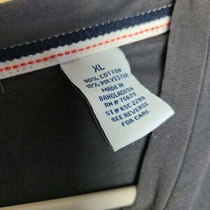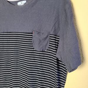 This is a short sleeved t-shirt by Thread & Cloth. The chest is color blocked grey and the body is striped black and white. There is a small pocket on the chest.